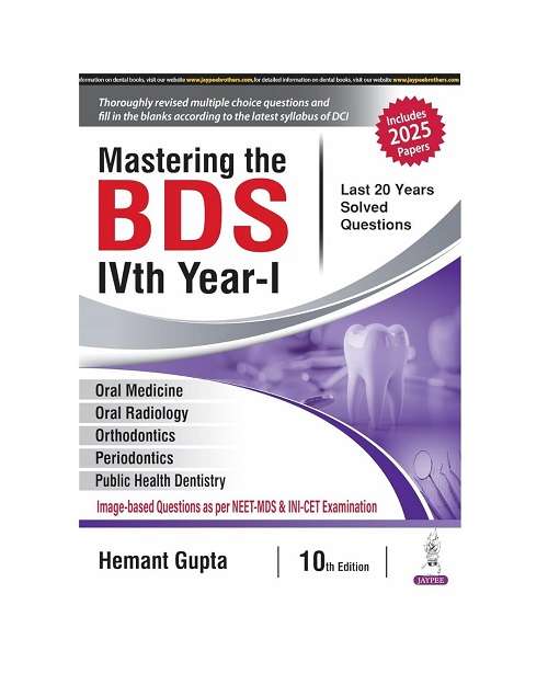 Main objective of the book is to highlight the gradual shift in philosophy of dental subjects towards exam orientation whether they are university examinations or competitive examinations. In this edition various new chapters are added along with recent advancements which gives an insight to the concepts of present era. Presentation of the book is simple and comprehensive which allows the students to easily understand and to develop the interest. The Mastering BDS is always praised as Geeta of Dental University Examinations and this is a great matter of pride for a question and answer cum MCQs as well as image-based questions (IBQs) book to reach such a great standard. This current edition is updated with addition of questions from various university examinations of year 2024 and 2025. It is written in simple and lucid language. Provides broad coverage of all the subjects of BDS final year-Part 1. Includes vast topics in simple flowcharts, tables, and diagrammatic forms so as to make the content easy-to-understand and recall. Supports in quick revision during examinations. One weapon, three targets, i.e., BDS examinations, PG entrance, and MDS (Basic Sciences): It is the only book written, which can be used to clear university graduation examinations, for postgraduate entrance examinations and also to crack basic sciences examination for postgraduate students. The earlier editions have been immensely popular among the dental students, postgraduate aspirants, and dental practitioners. Other highlights of the 10th edition are: Examination-oriented book with a unique collection of last 20 years solved question papers. Extensively revised and updated sections to provide knowledge of present era. “Questions and Answers” related to coronavirus disease 2019 (COVID-19) from university papers are covered. In “Oral Medicine”, all the classifications of drugs are mentioned separately in the end of section. Various recent advances are updated as per their recent revision. Consists of solved “Multiple Choice Questions (MCQs)” and “Fill in the Blanks”, which are added by Dental Council of India (DCI) in latest curriculum. All sections are thoroughly revised and various answers of previous editions are changed in latest edition due to change in various concepts and inculcation of new researches. One-liners are added for quick revision of dental postgraduate entrance examinations such as NEET, PGI, INI-CET, etc. Contains illustrations and high-quality photographs with explanatory legends for easy explanation of text. Provides recent and internationally accepted classification systems by eminent professional bodies, World Health Organization (WHO), Centers for Disease Control and Prevention (CDC), National Health Programs/guidelines such as Indian Council of Medical Research (ICMR), National Center for Disease Control (NCDC), Revised National Tuberculosis Control Program (RNTCP), National AIDS Control Organization (NACO), etc. Includes solved papers of years 2024 and 2025, with better and improved answers. Explains questions in point-wise manner for the clear overview and eye-catching remembrance. The text, multiple choice questions, and fill in the blanks aids students for competitive examination. Incorporates a clinical overview in various chapters for highlighting the clinical applications. A highly structured, user-friendly, systemic, and attractive layout with enriched illustrations.
